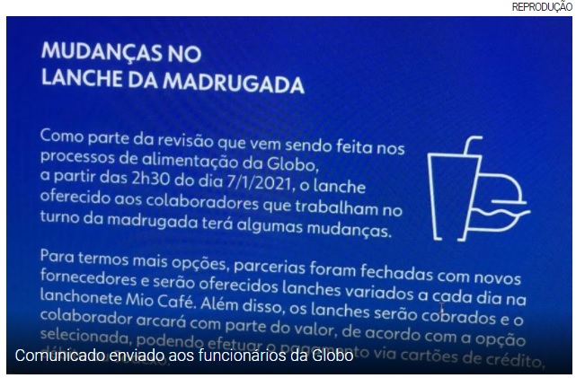 A partir desta quinta-feira (7), os funcionários que trabalham de madrugada na Globo não terão mais direito aos lanches gratuitos que antes eram oferecidos pela emissora. Essa é mais uma medida de corte de custos impostos em meio à pandemia. Em nota ao, a empresa informou que a determinação faz parte de uma revisão "dos processos para garantir maior integração e uniformização de suas políticas internas