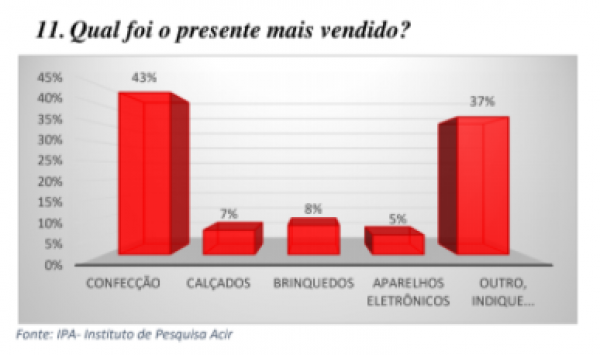 O presente mais vendido de acordo com 43% dos entrevistados foram confecções, para 8% dos entrevistados foram brinquedos, 5% dos entrevistados disseram que os aparelhos eletrônicos foram os mais escolhidos.