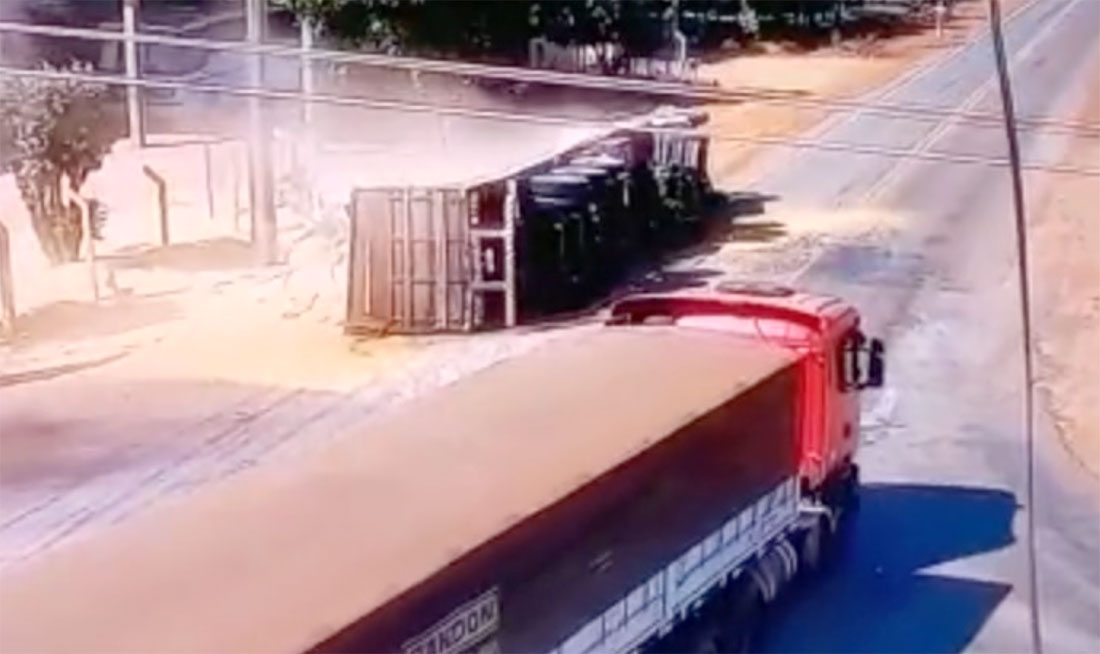 O acidente foi registrado por uma câmera de segurança. O motorista fazia uma conversão quando o vagão forçou para o lado esquerdo e tombou. Por conta disso, a carga se espalhou na pista.