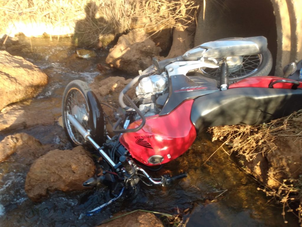 A Honda CG Start vermelha foi localizada, esta tarde, em um córrego na estrada Ana, após a avenida André Maggi e bairro Jardim Caribe. O veículo estava ainda com a chave e um capacete também foi encontrado. O proprietário, de 20 anos, estaria desaparecido desde ontem.