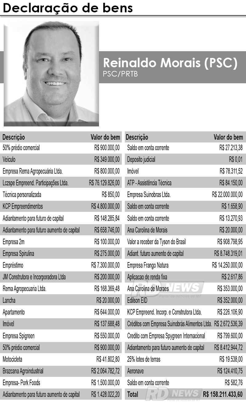 Candidato pela coligação “Muda Mato Grosso” (PSC e PRTB), Reinaldo tem como primeiro suplente o produtor agropecuário e extremista da direita Gilberto Cattani (PRTB). Com um Argo (R$ 60 mil), um sítio em Nova Mutum (R$ 900 mil) e 33 cabeças de gado leiteiro (R$ 60 mil), o postulante tem o total de R$ 1 milhão.