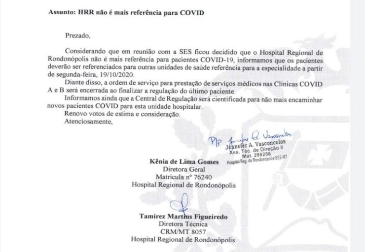 O Documento que afirma a suspensão dos atendimentos para pacientes infectados com covid19 no hospital regional de Rondonópolis, caiu como uma bomba nesta domingo (18) e preocupa a sociedade.