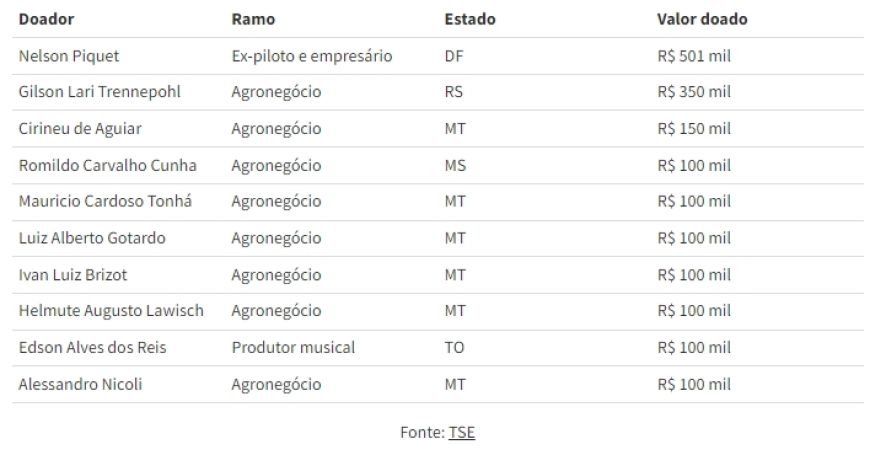 Dos dez maiores doadores de campanha até o momento, oito são empresários do agronegócio, dos quais seis são de Mato Grosso.