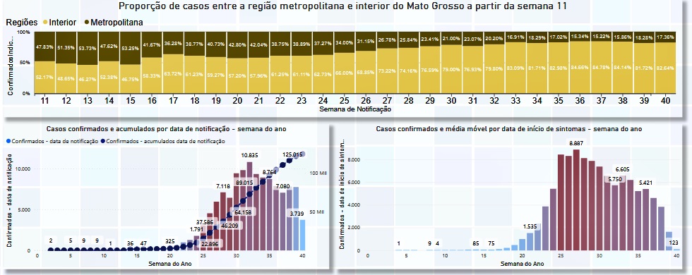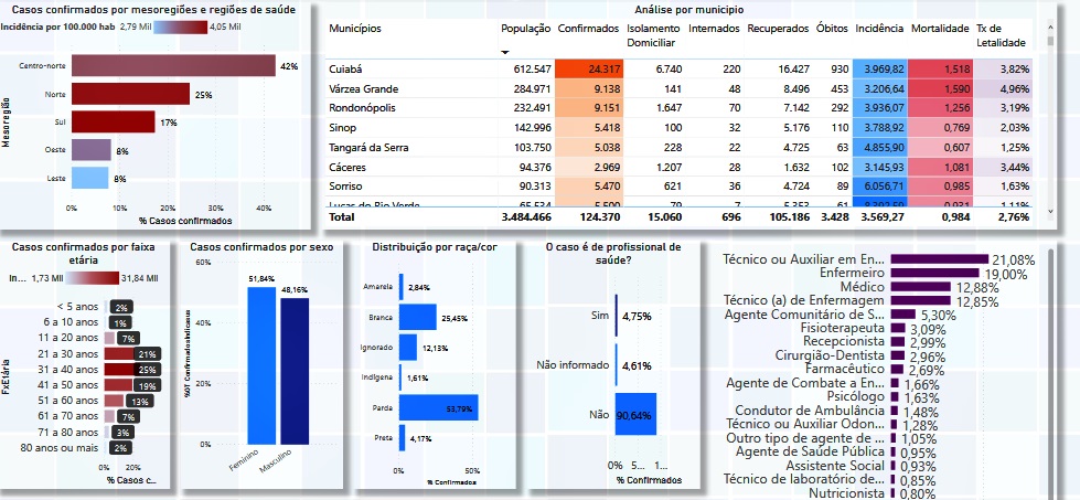 Dentre os dez municípios com maior número de casos de Covid-19 estão: Cuiabá (24.317), Várzea Grande (9.138), Rondonópolis (9.151), Lucas do Rio Verde (5.500), Sorriso (5.470), Sinop (5.418), Tangará da Serra (5.038), Primavera do Leste (4.140), Cáceres (2.969) e Campo Novo do Parecis (2.734).