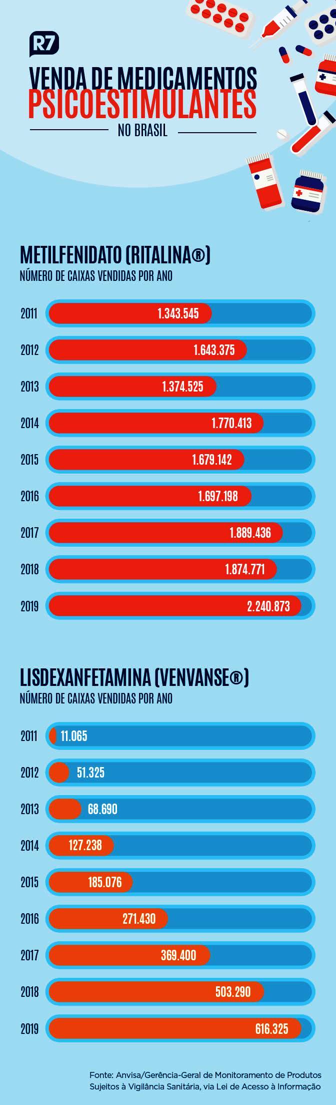 A lisdexanfetamina foi liberada pela Anvisa em julho de 2010. No ano seguinte, foram vendidas 11.065 caixas. Em 2012, foram 51.352: aumento de quase 364%. Em 2019, os dados mostram vendas de 616,3 mil caixas.