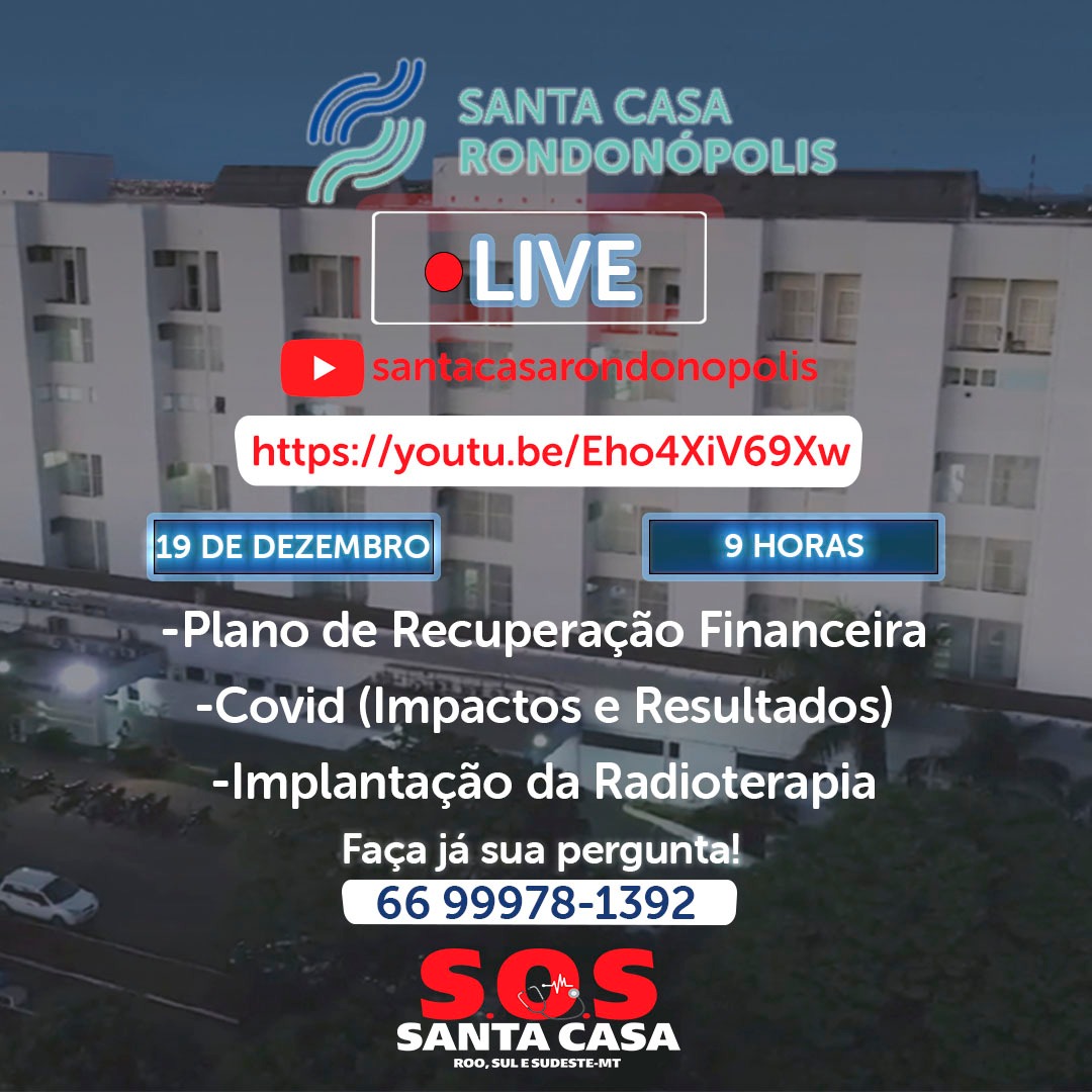 A Santa Casa Rondonópolis com o apoio do grupo de entidades que compõe o SOS Santa Casa, cumprindo com o compromisso assumido de dar transparência nas ações desenvolvidas, fará uma live, no dia 19 de dezembro, às 9 horas, pelo canal do Youtube Santa Casa Rondonópolis, por meio do link http://youtu.be/Eho4XiV69Xw, para apresentação de dados referentes ao ano de 2020.