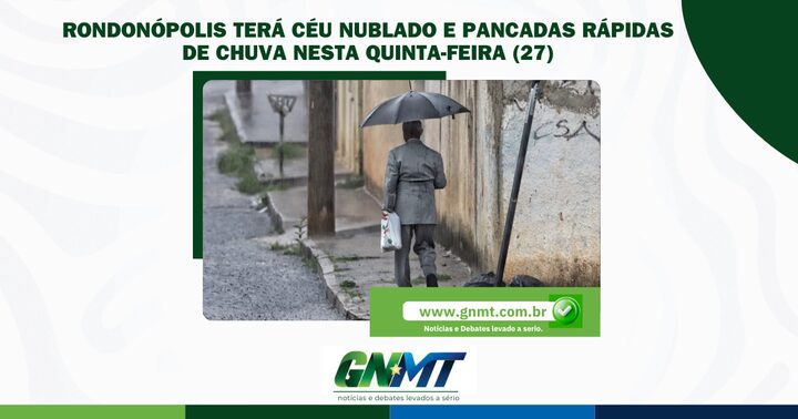 Rondonópolis deve enfrentar um dia de instabilidade climática nesta quinta-feira (27), com variação de nuvens e possibilidade de pancadas rápidas ao longo do dia. As temperaturas permanecem elevadas, oscilando entre 24°C e 37°C, conforme dados do Instituto Nacional de Meteorologia (Inmet).