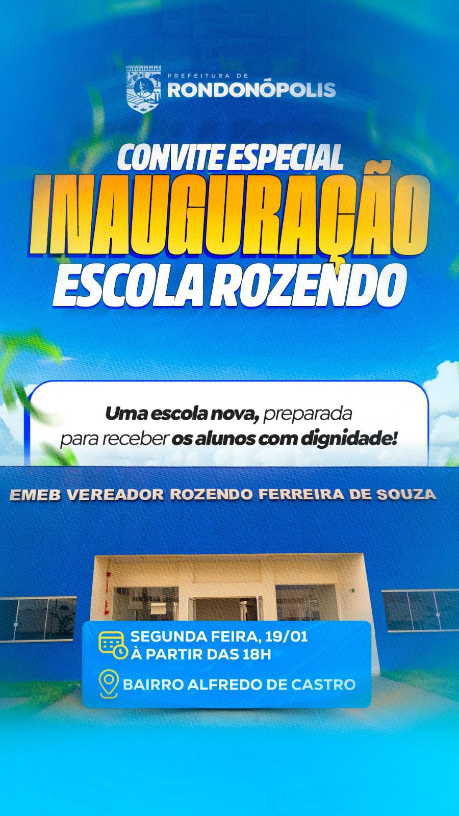 Será inaugurada nesta segunda-feira (19), no bairro Alfredo de Castro, uma nova escola que passa a levar o nome de Rozendo Ferreira de Souza, personalidade histórica que deixou uma contribuição marcante para o desenvolvimento político, social e urbano de Rondonópolis.