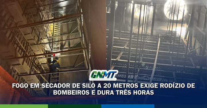 Um incêndio de grandes proporções mobilizou equipes do Corpo de Bombeiros por cerca de três horas nesta terça-feira (20), após fogo atingir um secador de grãos em um silo localizado a cerca de 20 metros de altura em uma unidade industrial no entorno de Cuiabá.
