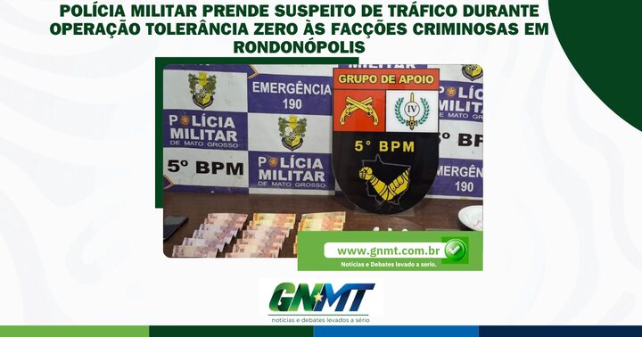A Polícia Militar prendeu na tarde desta terça-feira (25), no bairro Parque Universitário, em Rondonópolis, um homem suspeito de envolvimento com o tráfico de drogas. A ação ocorreu por volta das 17h50, durante a Operação Tolerância Zero às Facções Criminosas, realizada pelo 5º BPM, do 4º Comando Regional.