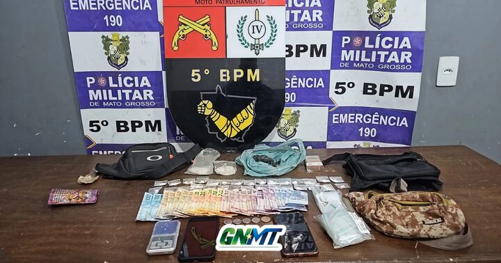 Os policiais iniciaram acompanhamento a pé e conseguiram abordar um dos suspeitos. Com ele, foram encontradas duas pochetes contendo entorpecentes, sendo porções de cloridrato de cocaína, pasta base e maconha, além de uma balança de precisão, dois celulares e R$ 628,25 em dinheiro.