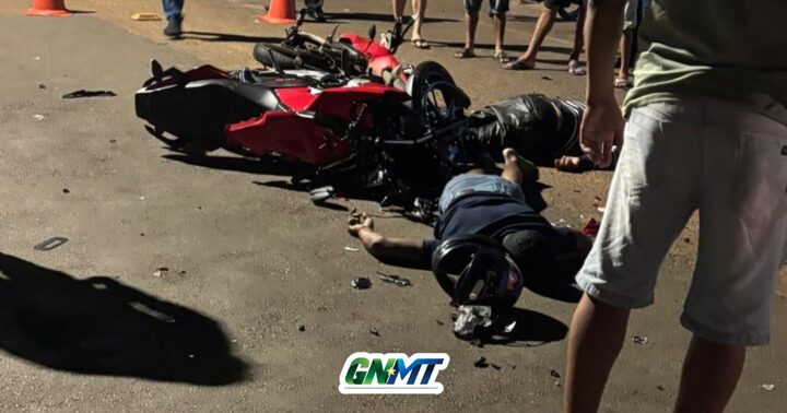 Um grave acidente envolvendo duas motocicletas deixou dois homens feridos na noite deste domingo (5), na Rua Rio Branco, no bairro Monte Líbano, em Rondonópolis.