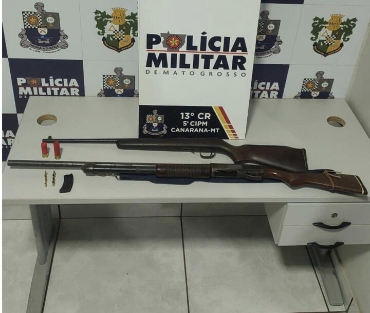 Policiais militares prenderam um homem de 57 anos, suspeito de maus-tratos a animais e porte ilegal de arma de fogo, na tarde desta sexta-feira (26.9), em Canarana. Com o suspeito, foram encontradas uma espingarda calibre 12, um rifle calibre 22 e dez munições.