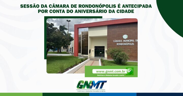 A Câmara Municipal de Rondonópolis comunicou que a sessão ordinária da próxima semana será realizada de forma antecipada. Em razão do feriado municipal de 10 de dezembro, data em que o município celebra seu aniversário, a reunião ocorrerá excepcionalmente na terça-feira (9), às 13h30.