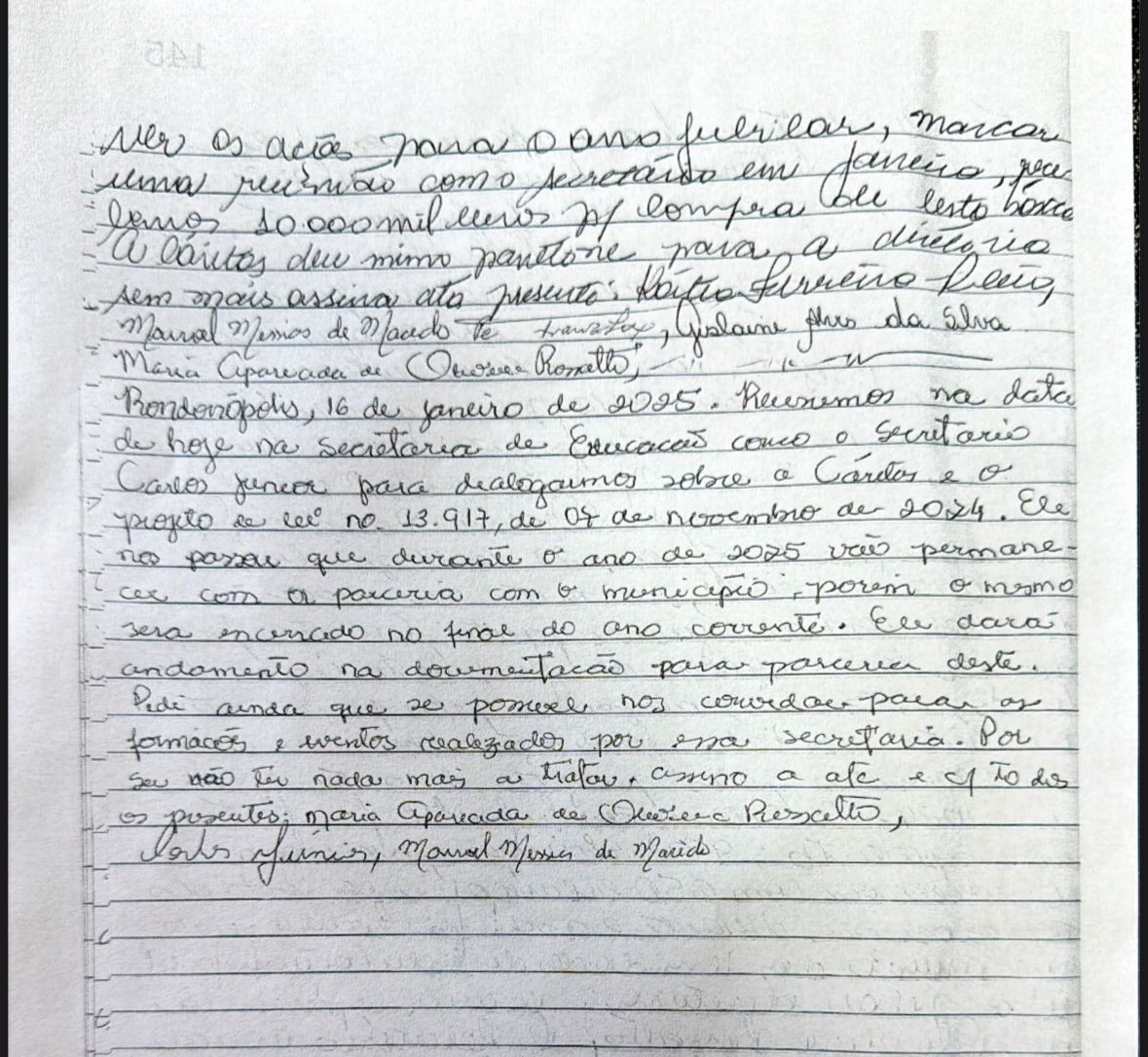 O registro, datado de 16 de janeiro de 2025, relata uma reunião entre a diretoria da Cáritas e o secretário municipal de Educação, Carlos Junior. No encontro, segundo descreve a ata, a entidade foi comunicada de que o convênio seria mantido somente ao longo de 2025, mas estaria encerrado a partir de 2026.