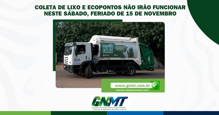 O Serviço de Saneamento Ambiental de Rondonópolis (Sanear) informou que, devido ao feriado da Proclamação da República, não haverá coleta de lixo neste sábado, 15 de novembro, em toda a cidade.