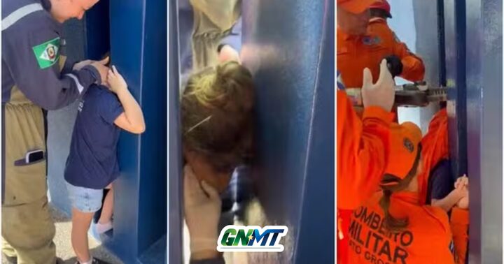 Imagens registradas no local mostram o momento em que uma bombeira segura a menina enquanto outros militares fazem o corte na viga para possibilitar o resgate.