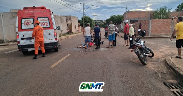 Um acidente envolvendo uma motocicleta e um carro foi registrado por volta das 17h deste domingo (5), no cruzamento da Rua Santa Maria com a Rua 3, no bairro Jardim Três Poderes, em Rondonópolis.